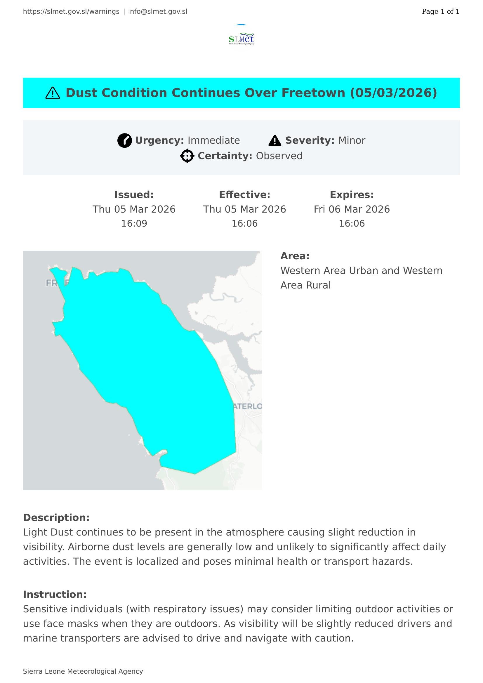 Light Dust continues to be present in the atmosphere causing slight reduction in visibility. Airborne dust levels are generally low and unlikely to significantly affect daily activities. The event is localized and poses minimal health or transport hazards.